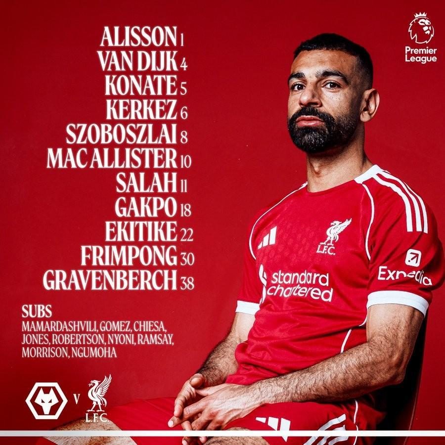 利物浦首发:1-阿利松、30-弗林蓬、4-范戴克、5-科纳特、6-凯尔凯兹、38-赫拉芬贝赫、8-索博斯洛伊、10-麦卡利斯特、11-萨拉赫、18-加克波、22-埃基蒂克