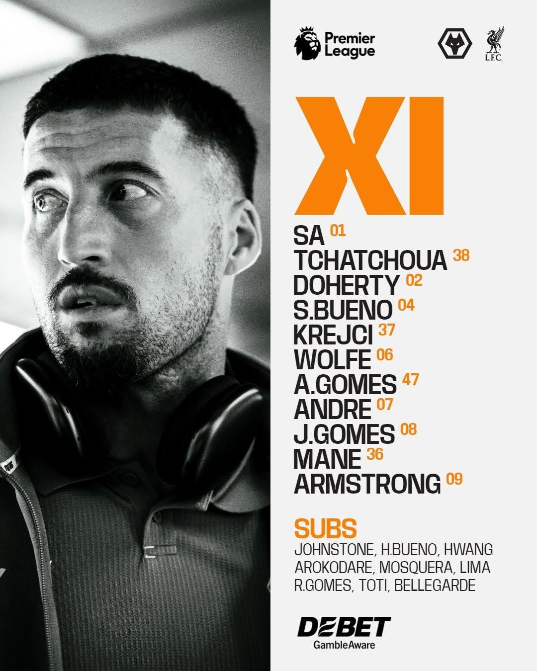 狼队首发:1-若泽-萨、38-查舒亚、2-多尔蒂、4-圣地亚哥-布埃诺、37-拉迪斯拉夫-克雷伊奇、6-戴维-沃尔费、7-安德烈、8-若昂-戈麦斯、47-安热尔-戈梅斯、36-马特乌斯-马内、9-亚当-阿姆斯特朗